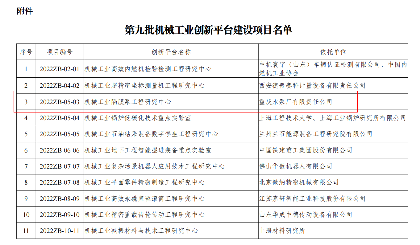 重泵公司再獲批國家級創(chuàng)新平臺 ----機械工業(yè)隔膜泵工程研究中心