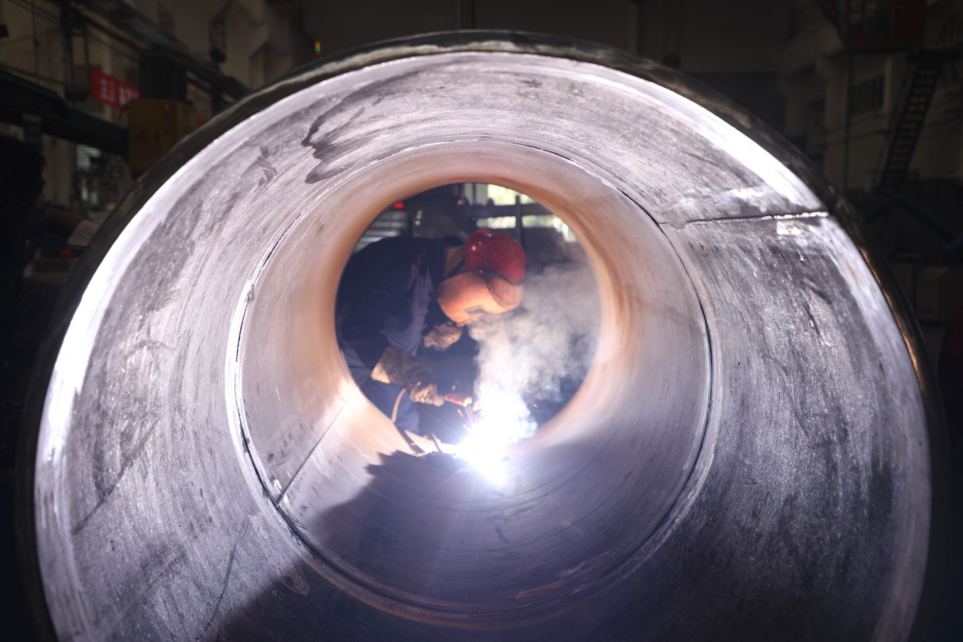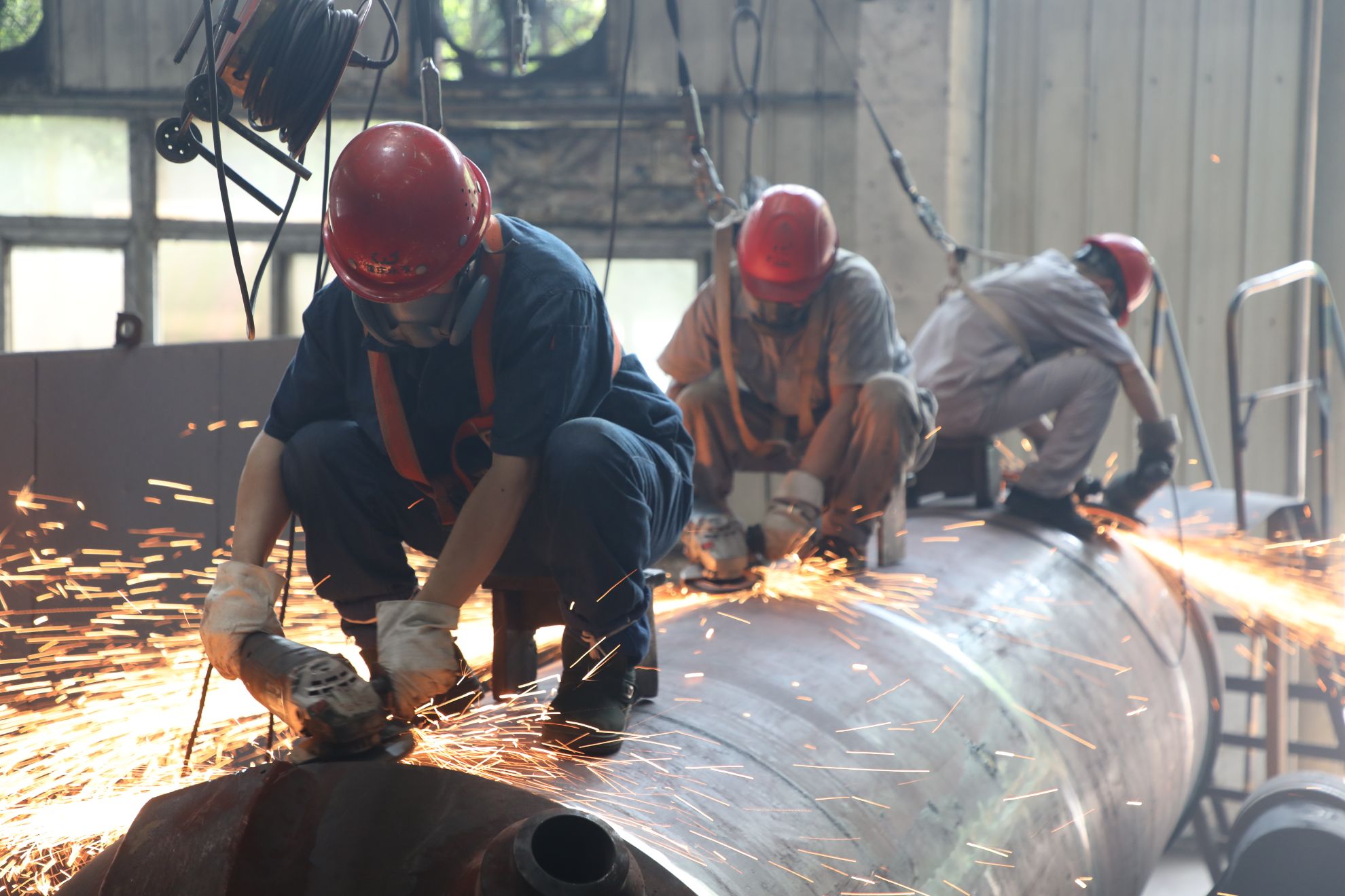 容器車間內(nèi)焊接區(qū)域的師傅們身著厚重的裝備細致地打磨著工件,盡管熱浪不斷地涌向車間,汗水浸濕了黃順兵的衣衫,工作服濕了又干,干了又濕,但師傅們依舊聚精會神地站在生產(chǎn)線上,目光里滿是認真專注。